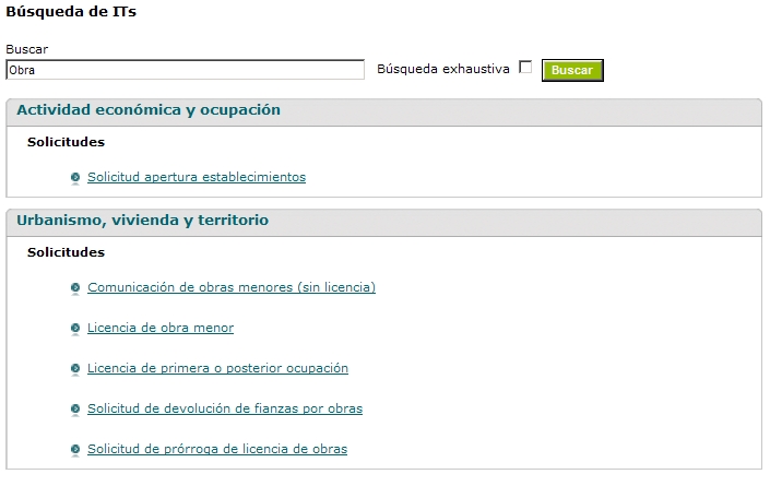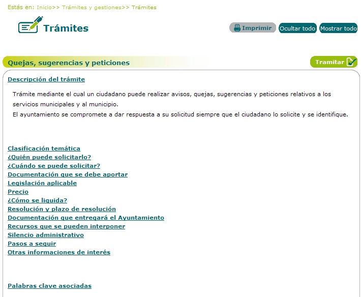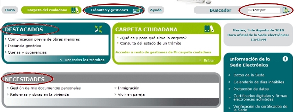 - Buscador de trámites. En la cabecera de todas las páginas dispone de un buscador por palabras clave que le permite localizar un determinado trámite.
