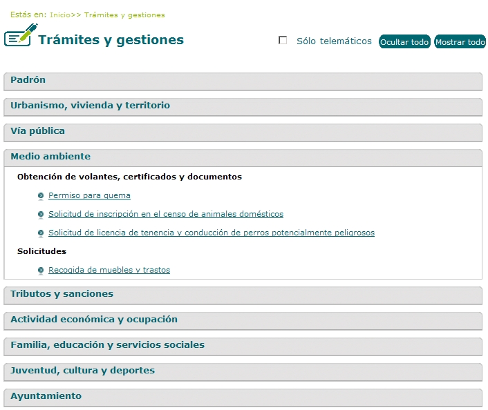 - Desde la opción Trámites de la barra de menú superior. Se entra en el visor que contiene la lista de trámites clasificada por categorías temáticas.